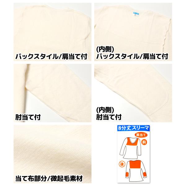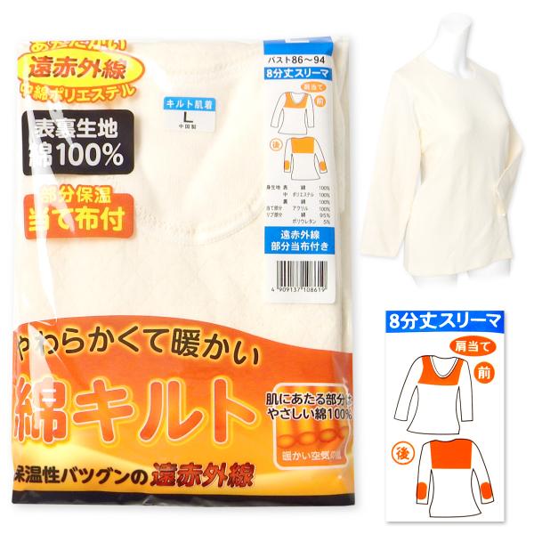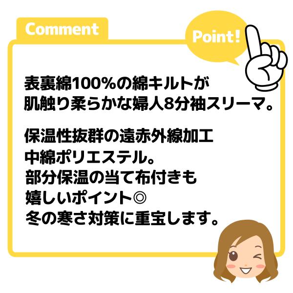 送料無料 婦人 レディース 綿キルト 8分袖 スリーマ 肌着 あったか素材 遠赤外線 部分保温当て布付 下着 インナー M L LL ygf-0106 メール便対応