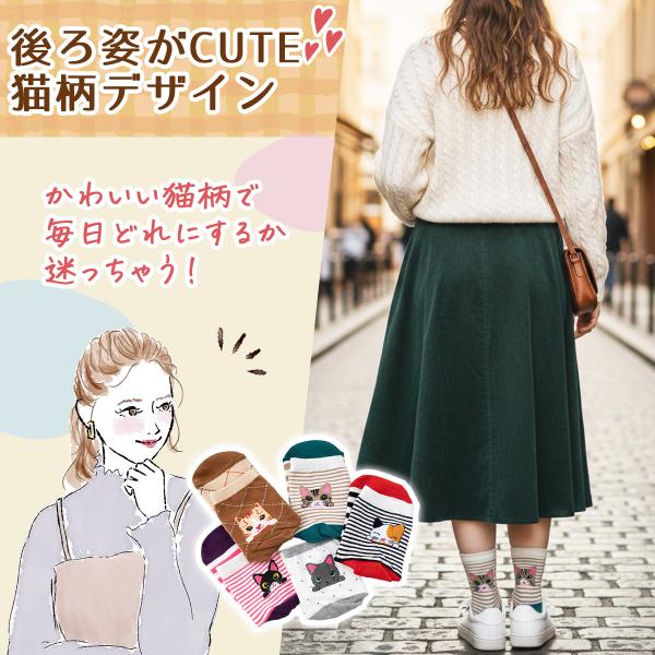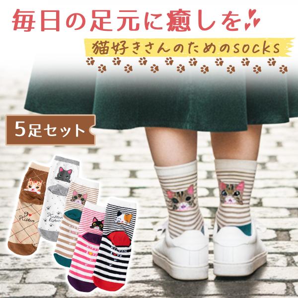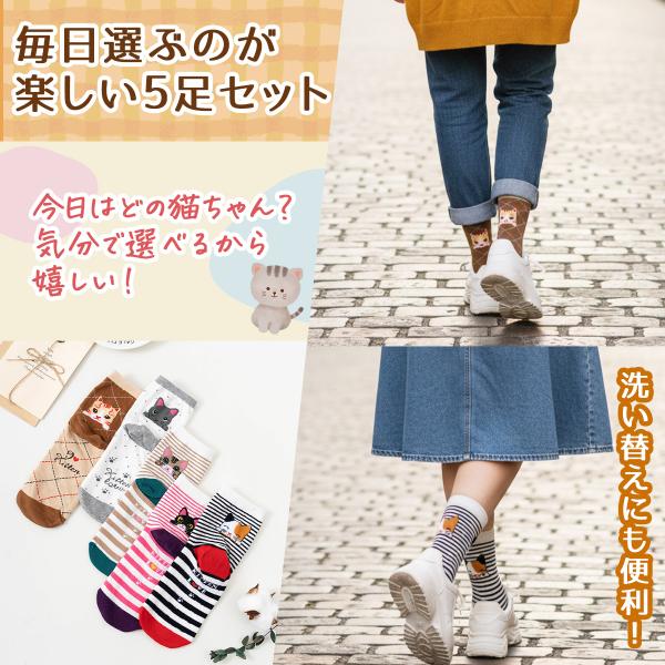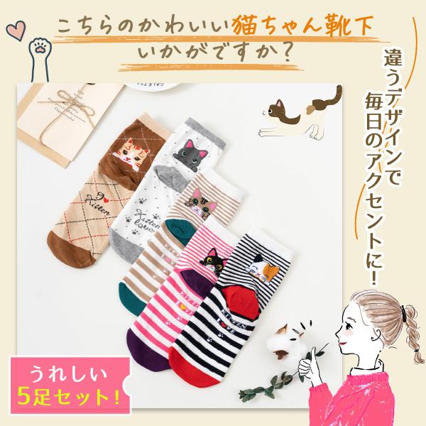 靴下 レディース 5足セット おしゃれ かわいい 猫柄 ソックス 韓国 クルー丈 コットン 綿 蒸れない 学生 通学 20代 30代 40代 プレゼント