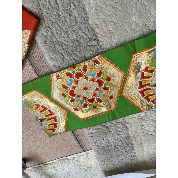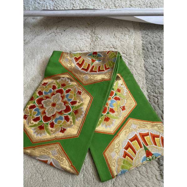貸衣装処分品 古いレトロ帯 緑 紋柄 袋帯 410cm