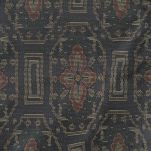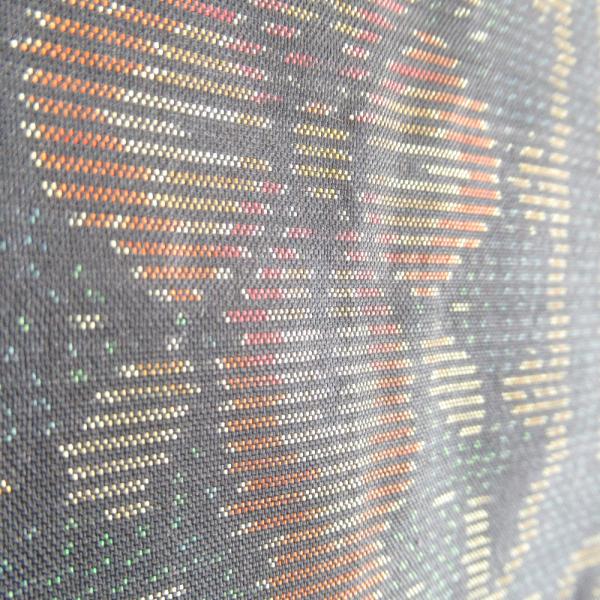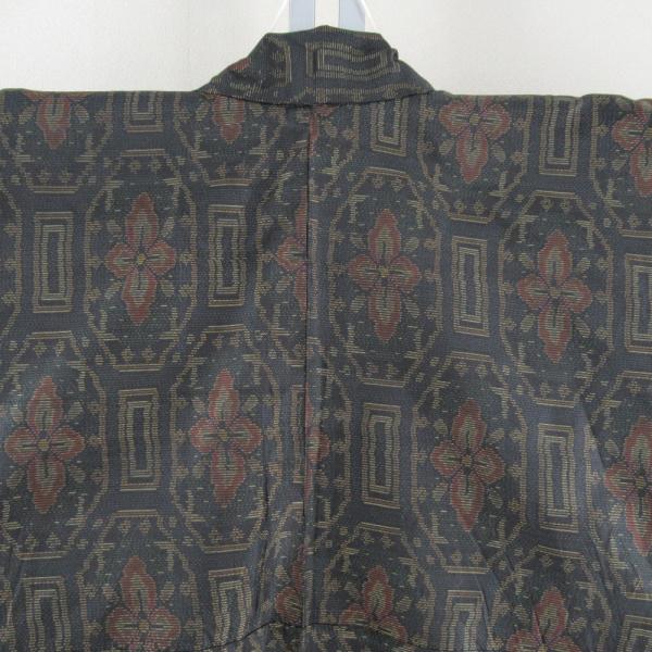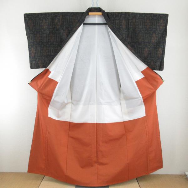 紬 着物 大島紬 幾何学模様に花 黒色xオレンジ色x緑色 袷 広衿 正絹 仕立て上がり着物 身丈158cm