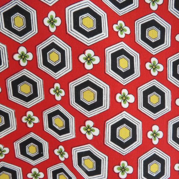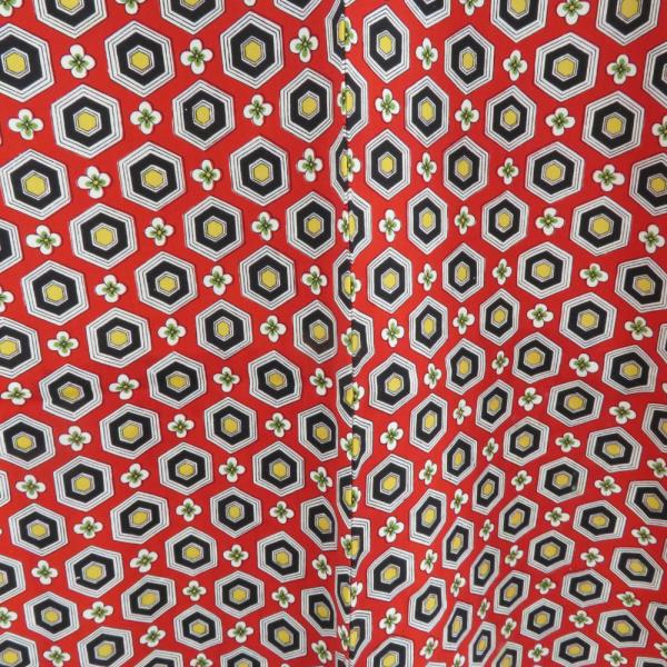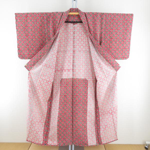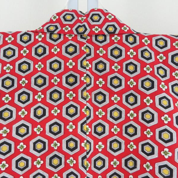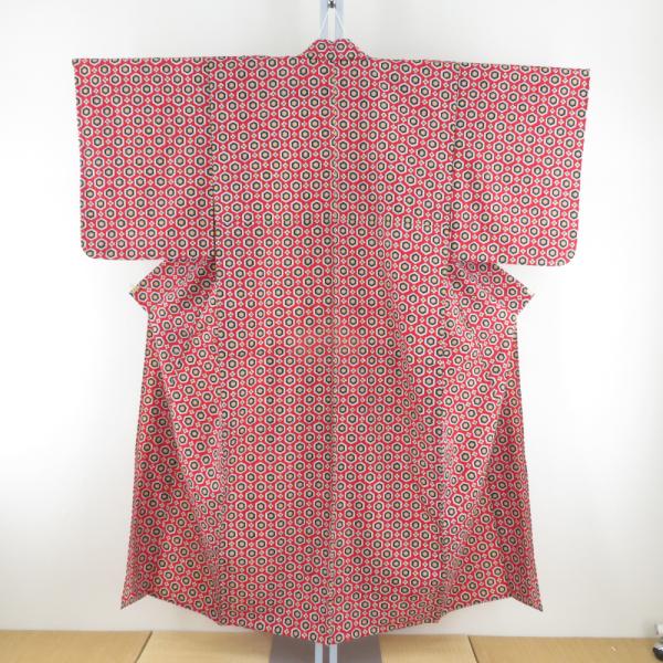 ウール着物 アンサンブル 着物と羽織2点セット 単衣 赤色x黄色x黒色 亀甲に小花模様 バチ衿 カジュアルきもの 普段着物 身丈148cm