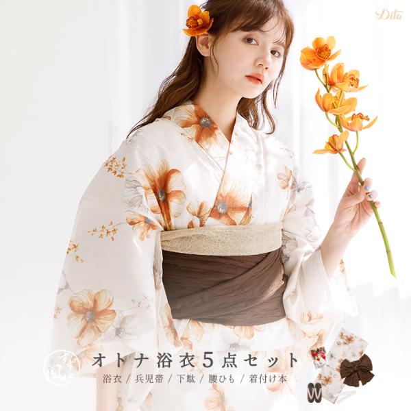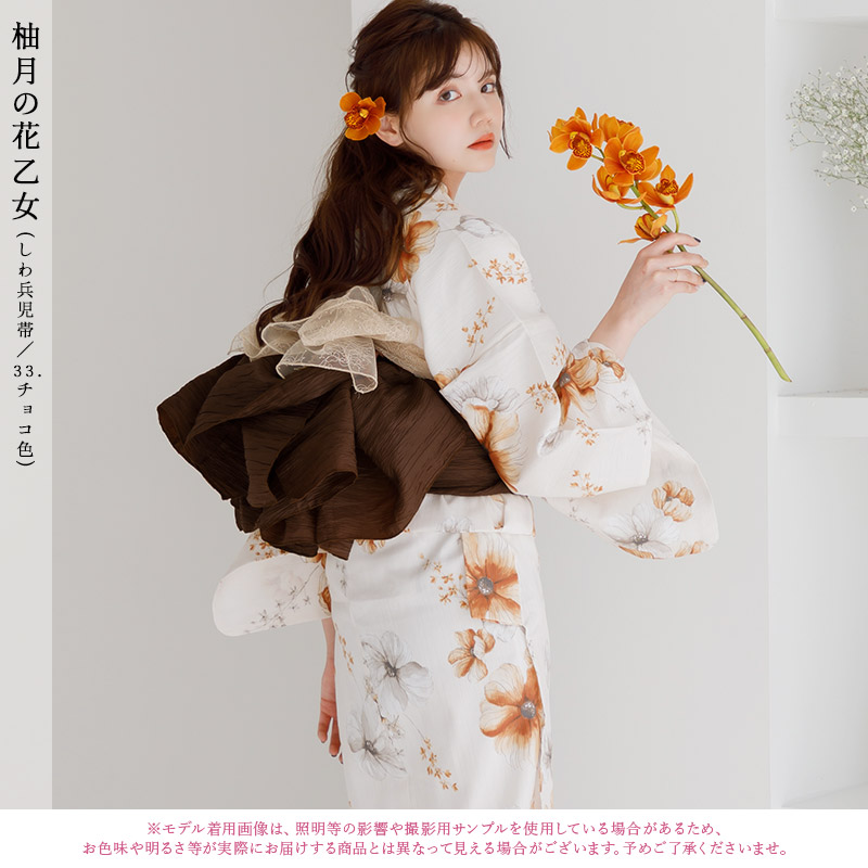 【先行予約/5月中旬より順次発送予定】浴衣セット レディース 簡単(ゆかた・しわ兵児帯・下駄・着付け本・腰ひも)綿 オレンジ