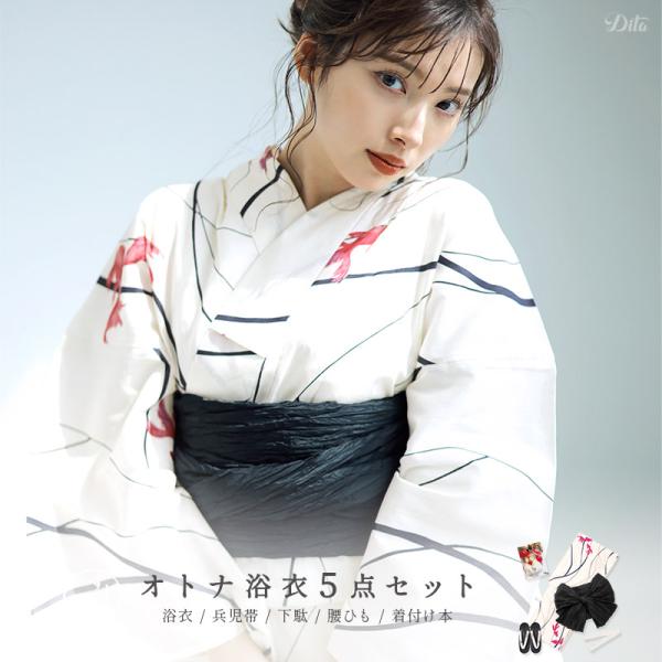 【先行予約/5月中旬より順次発送予定】浴衣セット レディース 簡単(ゆかた・しわ兵児帯・下駄・着付け本・腰ひも)綿 金魚