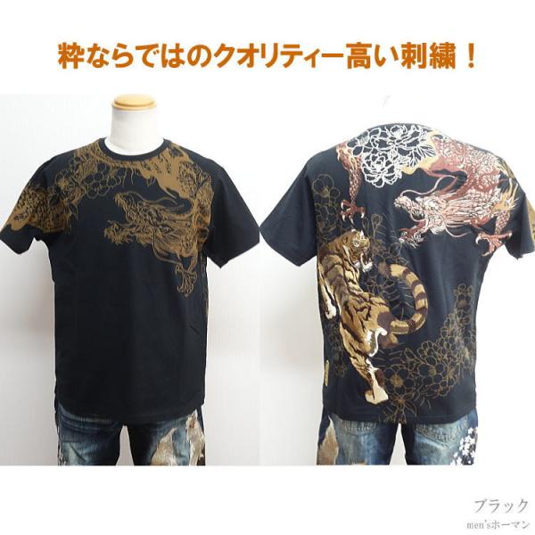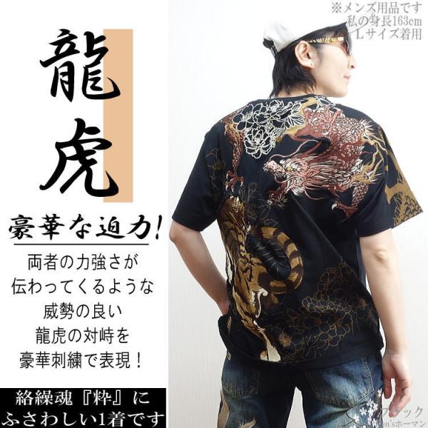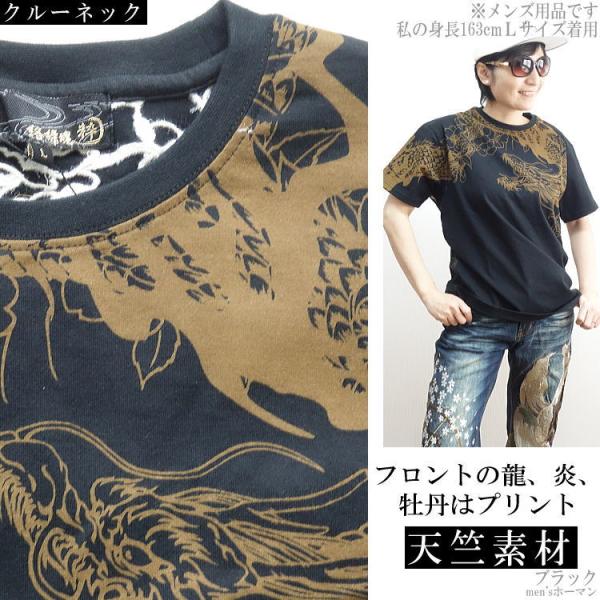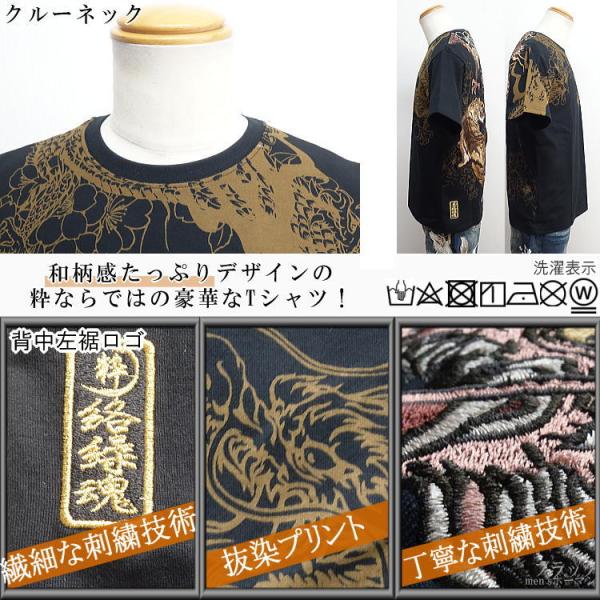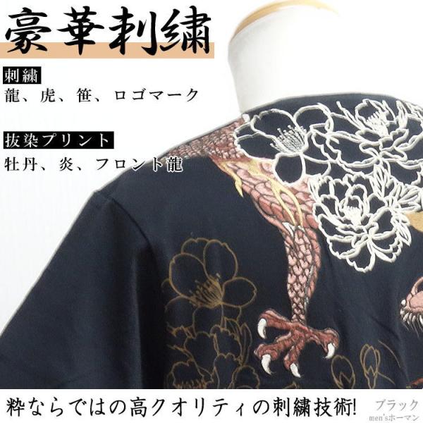夏物 絡繰魂/カラクリ魂/からくり魂 粋 龍虎刺繍 牡丹刺繍 炎 ロゴ刺繍 炎 抜染 クルーネック 天竺素材 個性派 和柄カジュアル TEE 半袖Tシャツ 黒:M 222020
