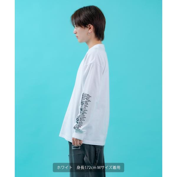 ロンT メンズ レディース 長袖Tシャツ ステッカーロゴ 袖プリント ファイヤーパターン ストリート オーバーサイズ 韓国ファッション