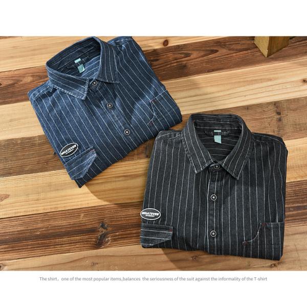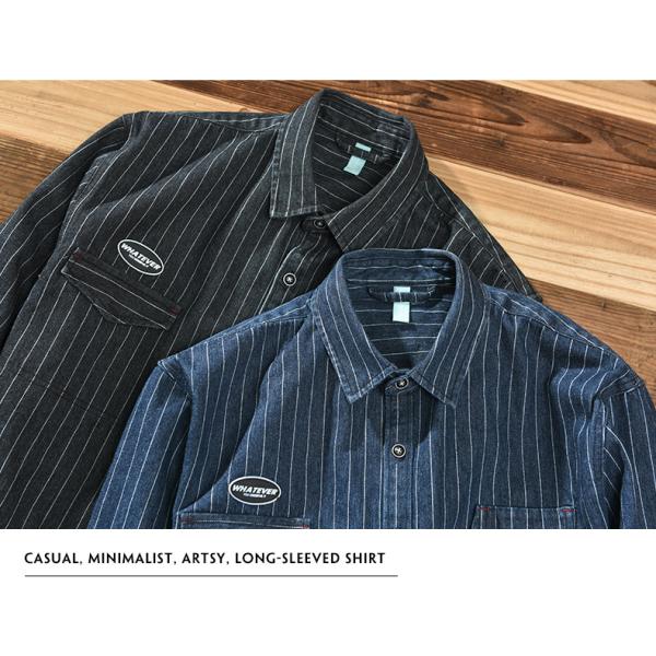 デニムシャツ ストライプ アメカジ カレッジ 非対称ポケット 柄物 メンズコーデ デニム トップス ライトジャケット 黒 紺 秋冬 長袖シャツ