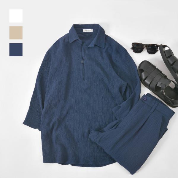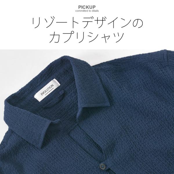 シャツ メンズ カプリシャツ 7分丈 リゾートシャツ スキッパーシャツ ストレッチ イタリア系 サーフ系 ビター系 春夏秋 ホワイト グレージュ ネイビー 白 紺 M L