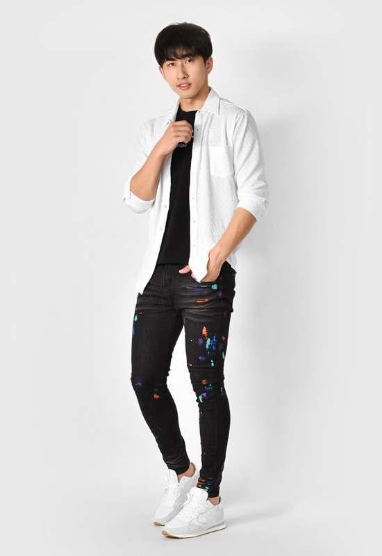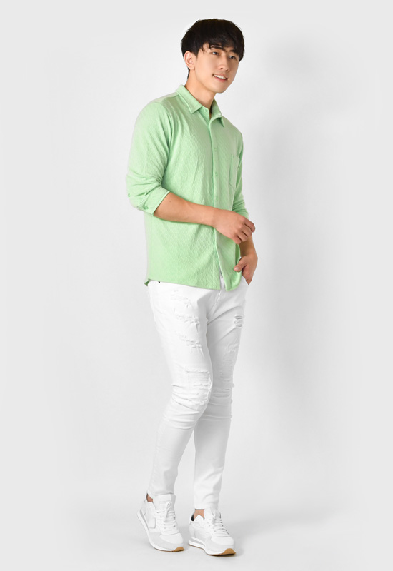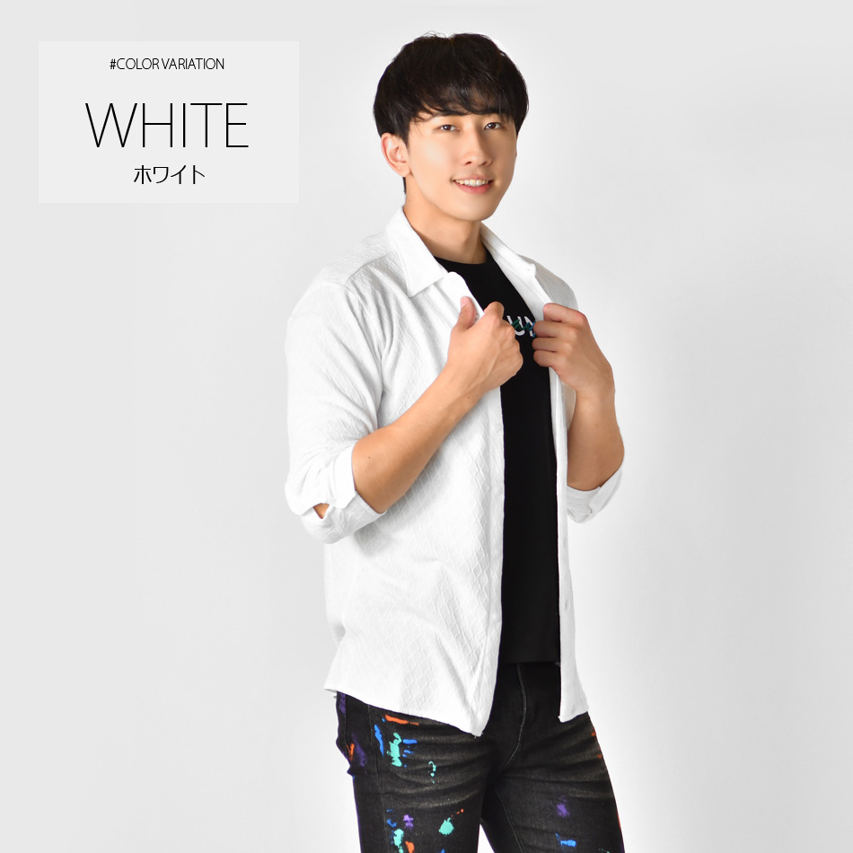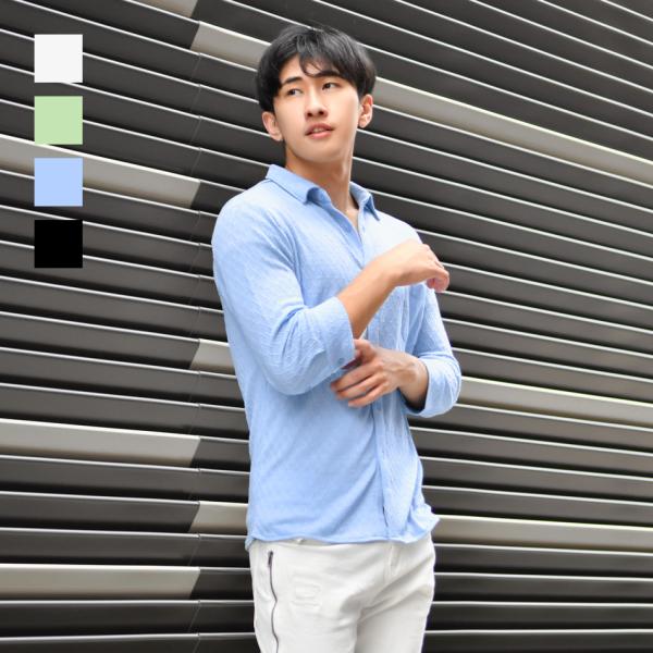 シャツ メンズ ニット カジュアル 無地 ストレッチ 七分袖 タイト 春夏秋 サーフ系 オラオラ系 白 緑 青 黒 ホワイト グリーン サックスブルー ブラック M L XL