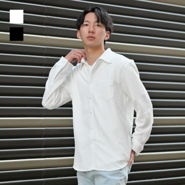 シャツ メンズ カジュアルシャツ 春夏秋 ジャガード ランダムサッカー 速乾 長袖 タイト 細め ホワイト ブラック 白 黒 M L XL LL 2L