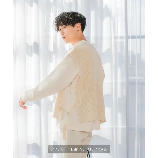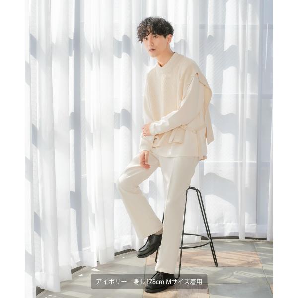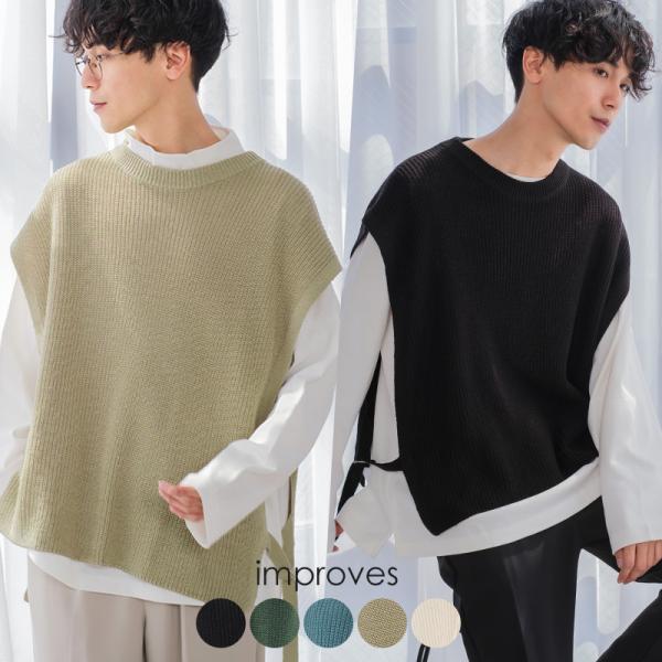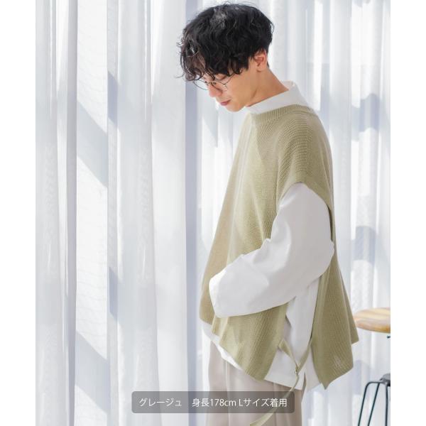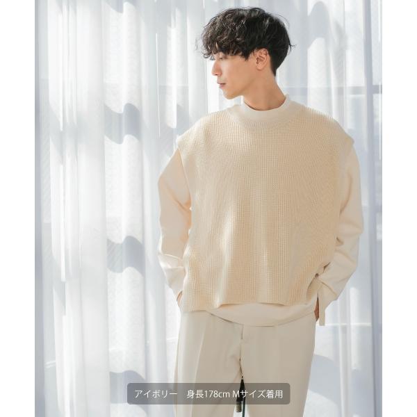ニット ベスト 畦編み ざっくり ゆったり オーバーサイズ サイドリングベルト 丸首 クルーネック 無地 メンズ