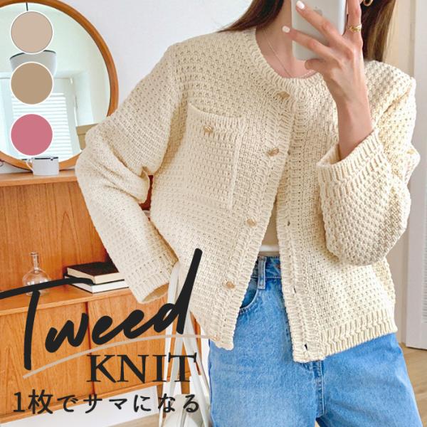 ニットジャケット レディース 春 通販 ツイードジャケット ノーカラージャケット カーディガンジャケット ニットカーディガン フォーマル ニットジャケット