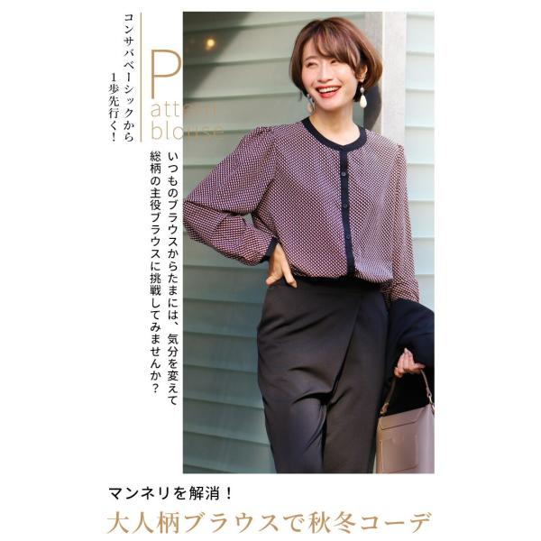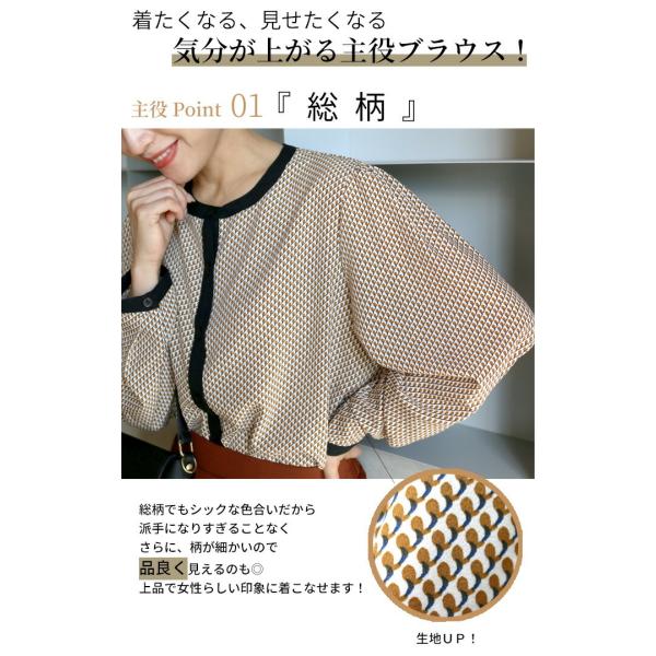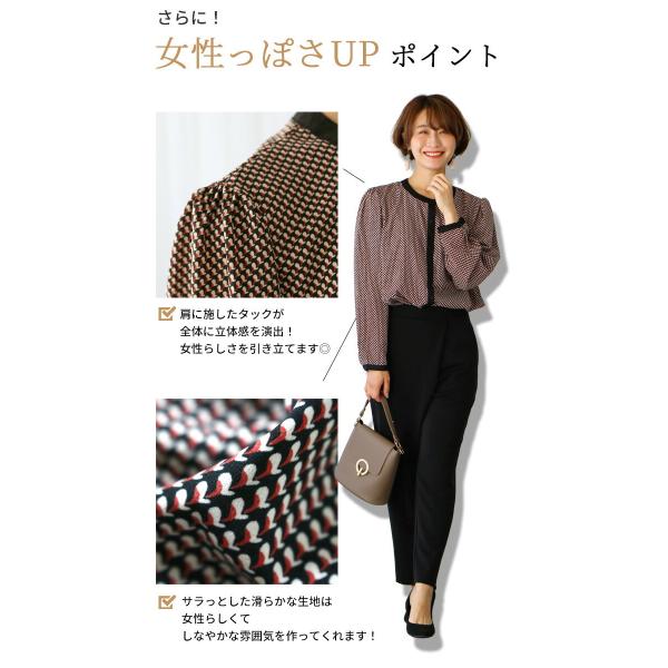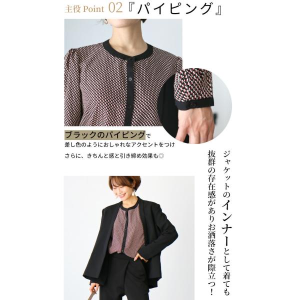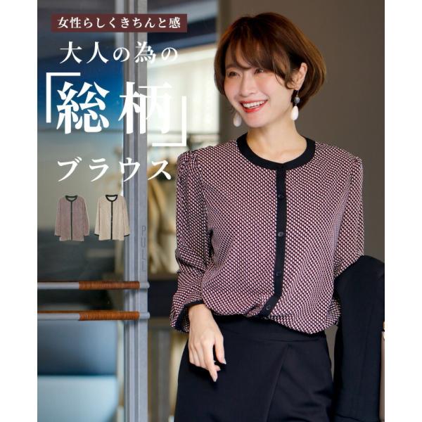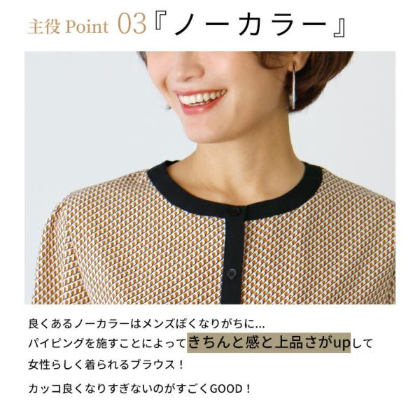ブラウス トップス オフィス 総柄 柄物 パイピング ノーカラー 前ボタン フロントボタン 仕事服 きれいめ お仕事 オフィスシーン 通勤着 上品