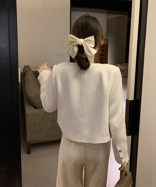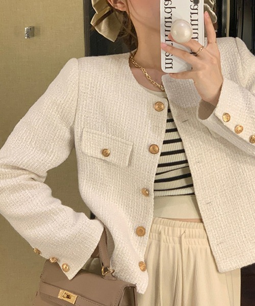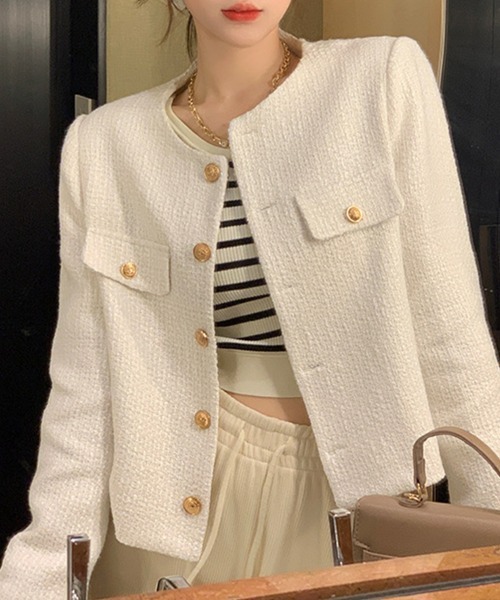 ジャケット ノーカラージャケット 「お気に入り2万突破!」ノーカラーツイードショートジャケット オフィスカジュアル きれいめカジュアル レディース韓国
