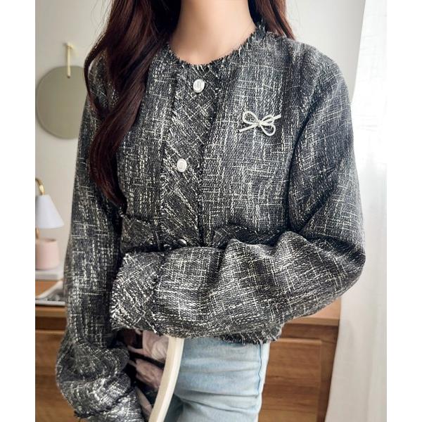 ジャケット ノーカラージャケット きらめく魔法に甘さを添えて♪リボンブローチ使い長袖ラメ入りツイードジャケット レディース