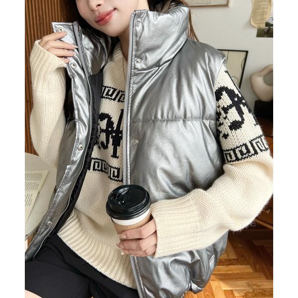 ダウンベスト ベスト フェイクソフトレザースタンドカラーファイバーダウンベスト レディース