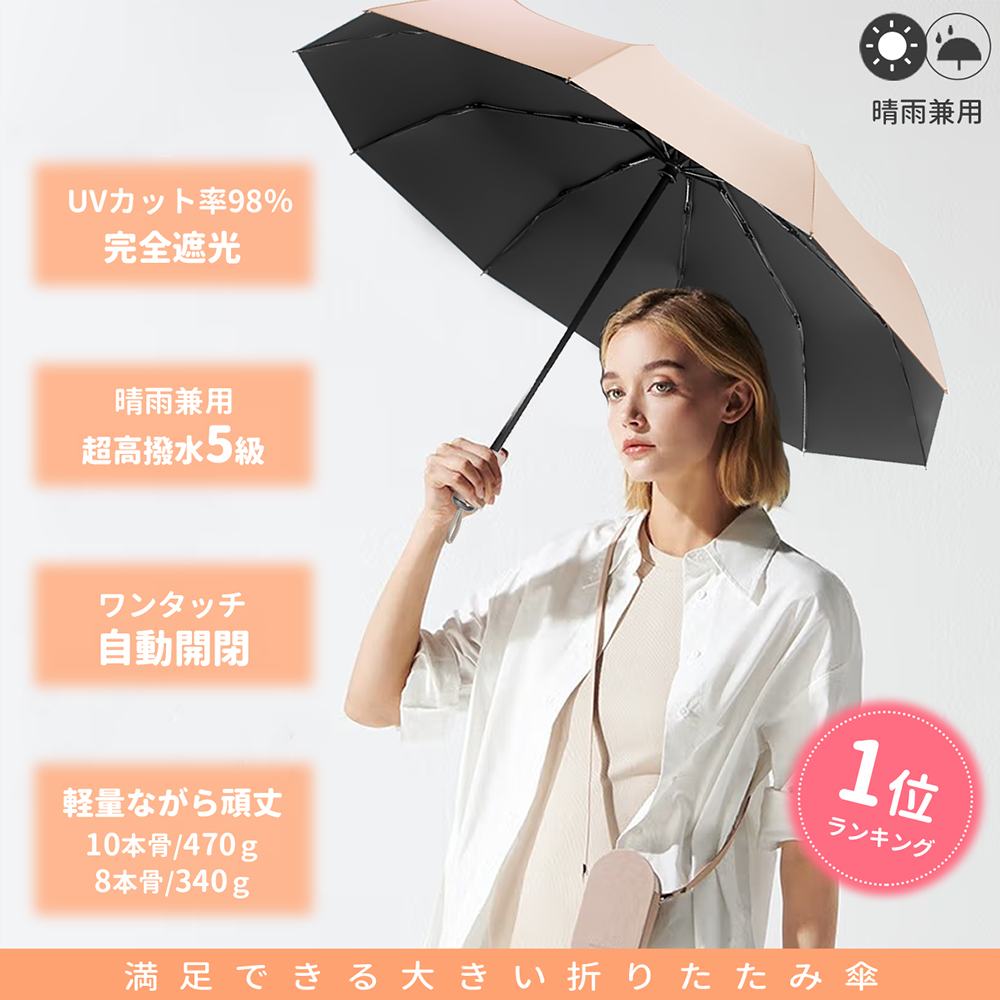日傘 自動開閉 晴雨兼用 折りたたみ 傘 大きめ 10本骨 8本骨 遮光率100% 撥水5級 紫外線対策 UVカット ワンタッチ 耐風 遮熱