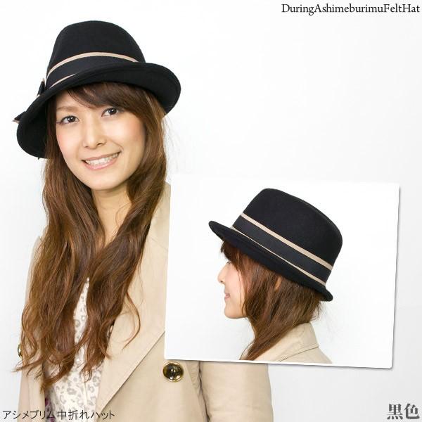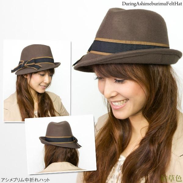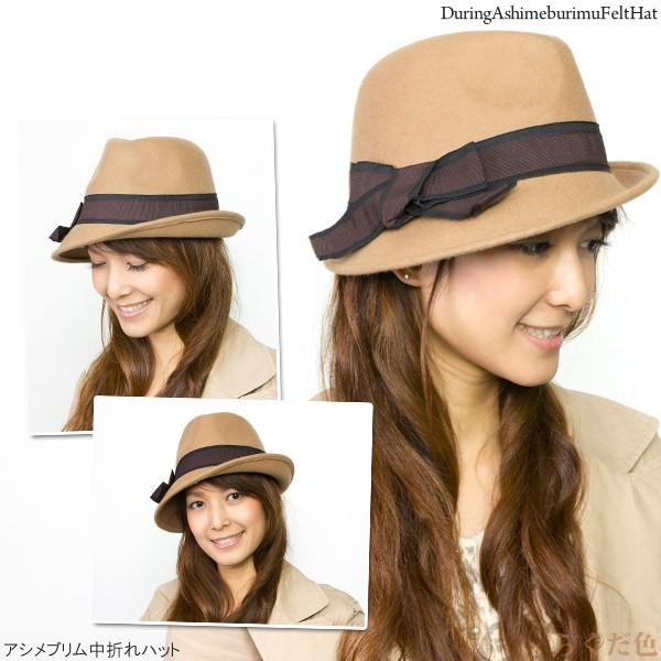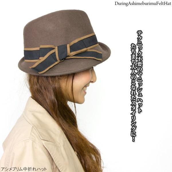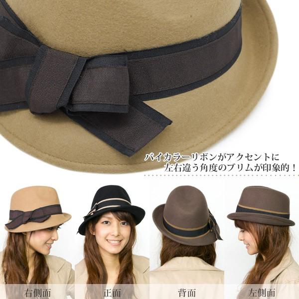 帽子 レディース フェルト サイズ調整 秋冬 リボン アシメブリム中折れハット