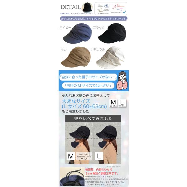 帽子 レディース UV キャスケット 大きいサイズ つば広 折りたたみ 近赤外線 UPF 遮光 春 夏 飛ばない 涼しい 小顔 すっぴん隠し 綿麻タックキャスケット