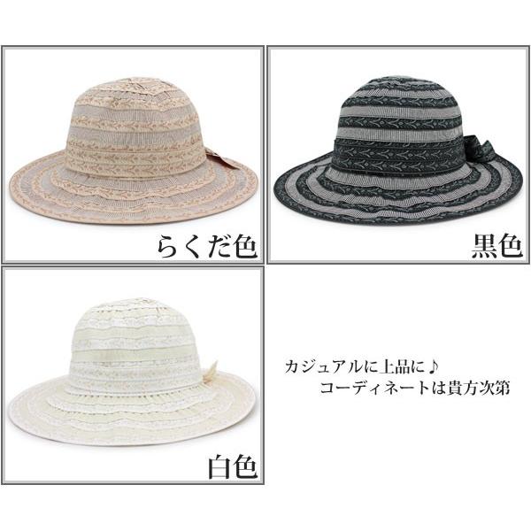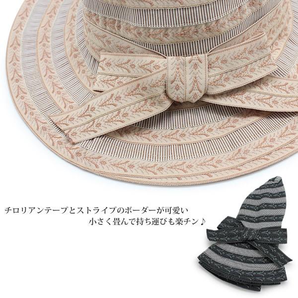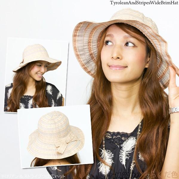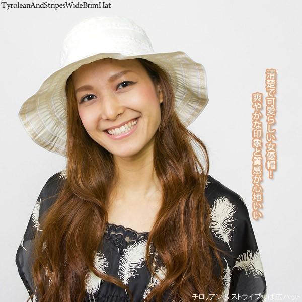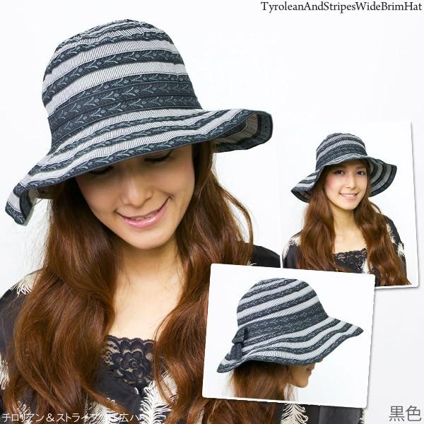 帽子 レディース つば広 女優帽 UV対策 ハット チロリアン&ストライプつば広ハット
