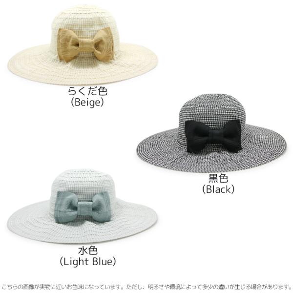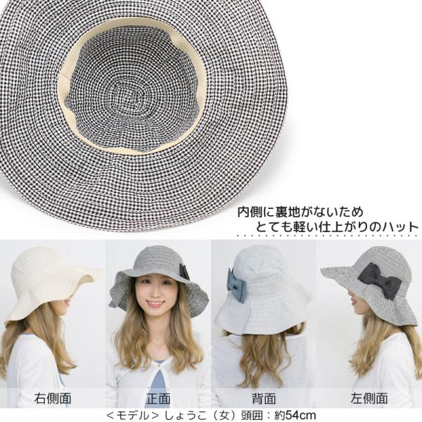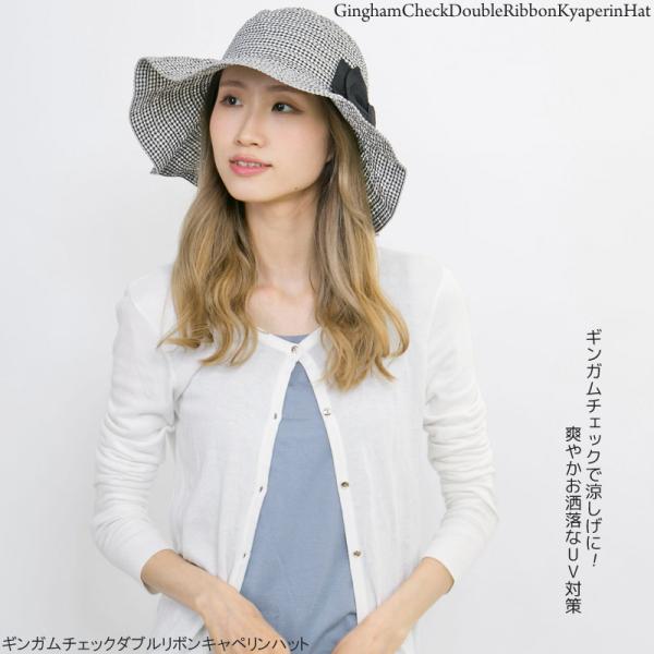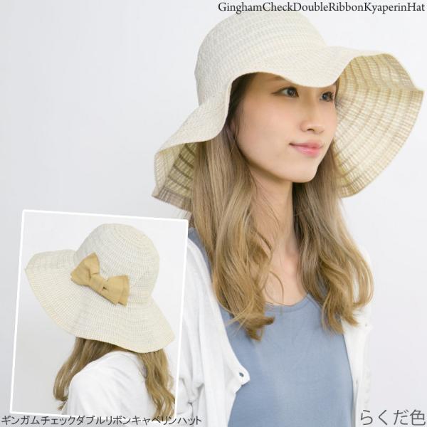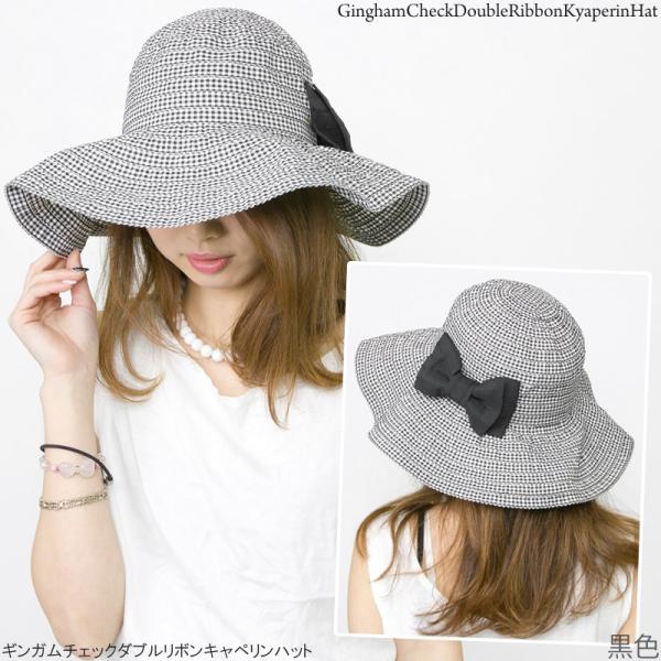 帽子 レディース 女優帽 つば広 折りたたみ ハット 春夏 ギンガムチェック ダブルリボン キャペリンハット