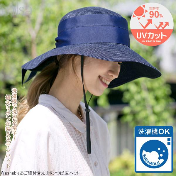 洗濯機で洗える 麦わら帽子 レディース あご紐付き サンハット uv たためる 春夏 太リボン 吸汗速乾 つば広ハット