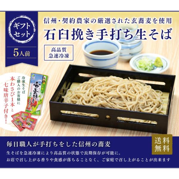 母の日 父の日 信州手打ち蕎麦 5人前ギフトセット 高品質冷凍生そば 特製蕎麦つゆ&おろし本わさび&七味唐辛子のセット 信州のそば職人が打つ本格手打ちそば
