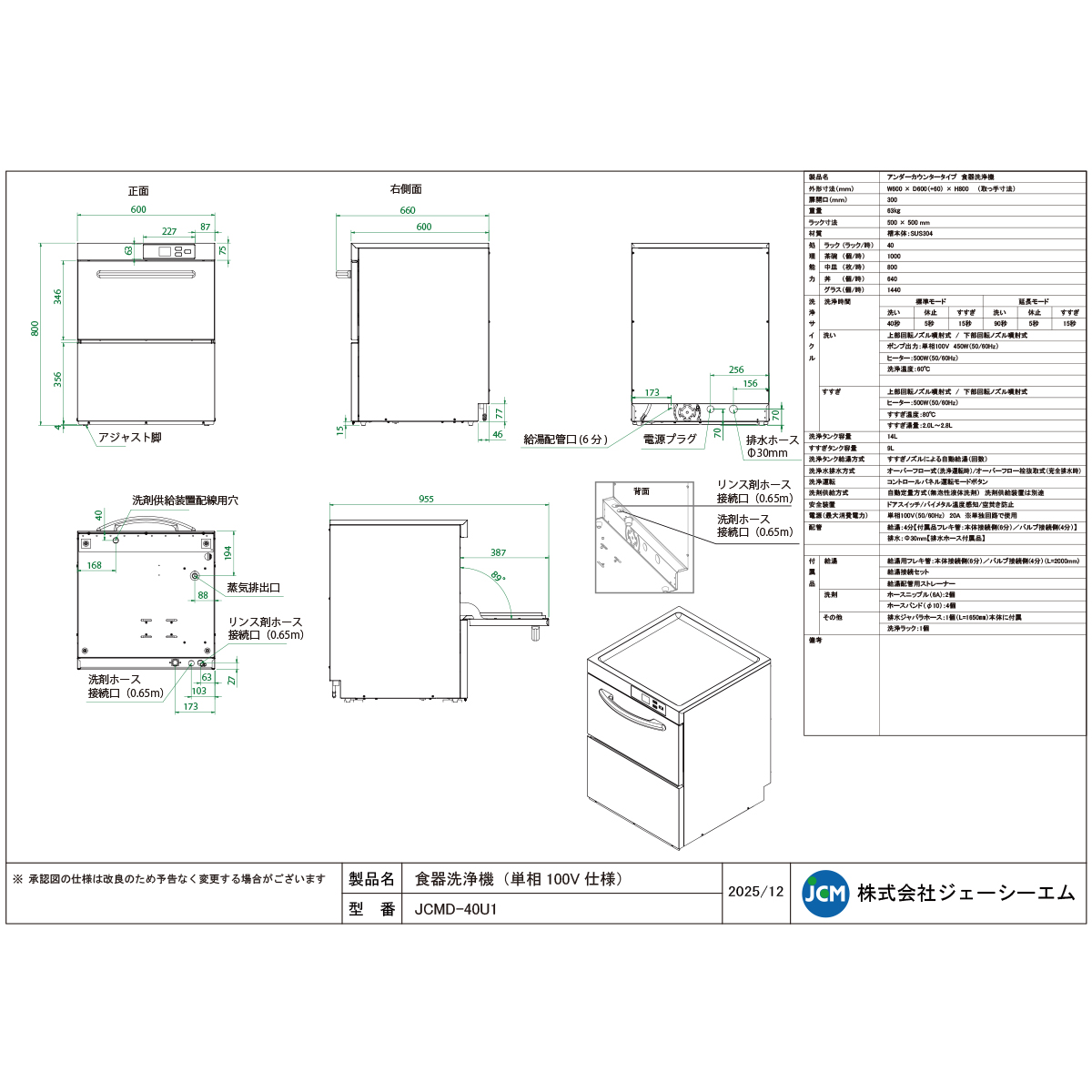 JCM 業務用食器洗浄機 食器洗浄機 JCMD-40U1 業務用 洗浄機 アンダーカウンター 幅600×奥行600×高さ800mm 一年保証 【代引き不可】