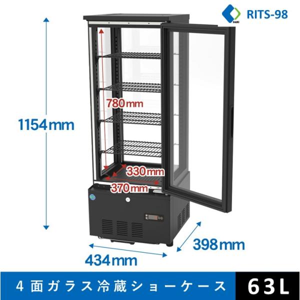 ★助成金対象商品★4面ガラス冷蔵ショーケース ビールショーケース RITS-98 冷蔵庫 保冷庫 ガラスショーケース タテ型冷蔵庫 業務用 LED照明 黒 【送料無料】