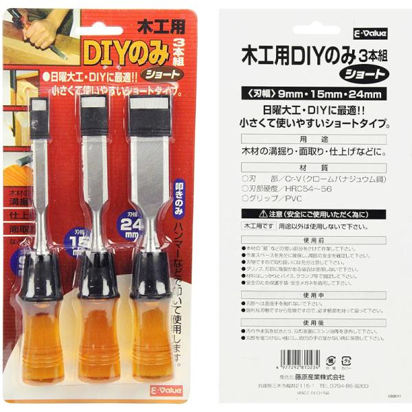 E-Value 木工用DIYのみ 3本組 ショート ノミ 9mm 15mm 24mm 4977292810234