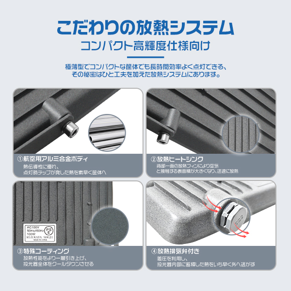 台数選択可 極薄LED投光器 作業灯 100W 正圧排気弁付き 85V-265V 19600lm 屋外 防水 160°広角照射 IP67 高輝度 高効率 省エネ PSE PL 2年保証