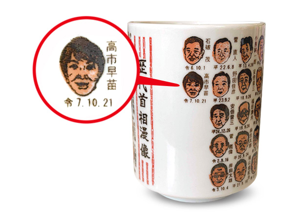 こちらはアウトレット品です。【高市新総理大臣が載った 】【2025年10月更新 】 歴代首相漫像湯呑み 270cc 山志製陶所 高市早苗 物知り湯呑