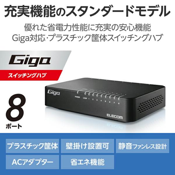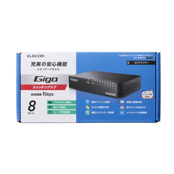 エレコム Giga対応 スイッチングハブ 8ポート プラ筐体 ACアダプター プラスチック筐体 電源外付モデル ブラック EHC-G08PA4-B