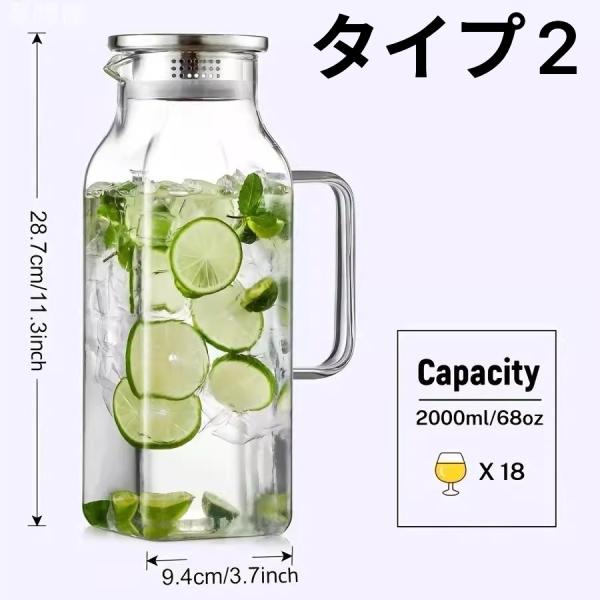 麦茶ポット 2L 大容量 冷水筒 耐熱ガラス 冷水ポット ピッチャー 広口 洗いやすい 2リットル 取っ手付き お茶ポット ティーポット スクエアサー