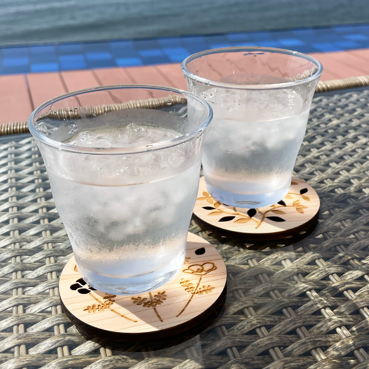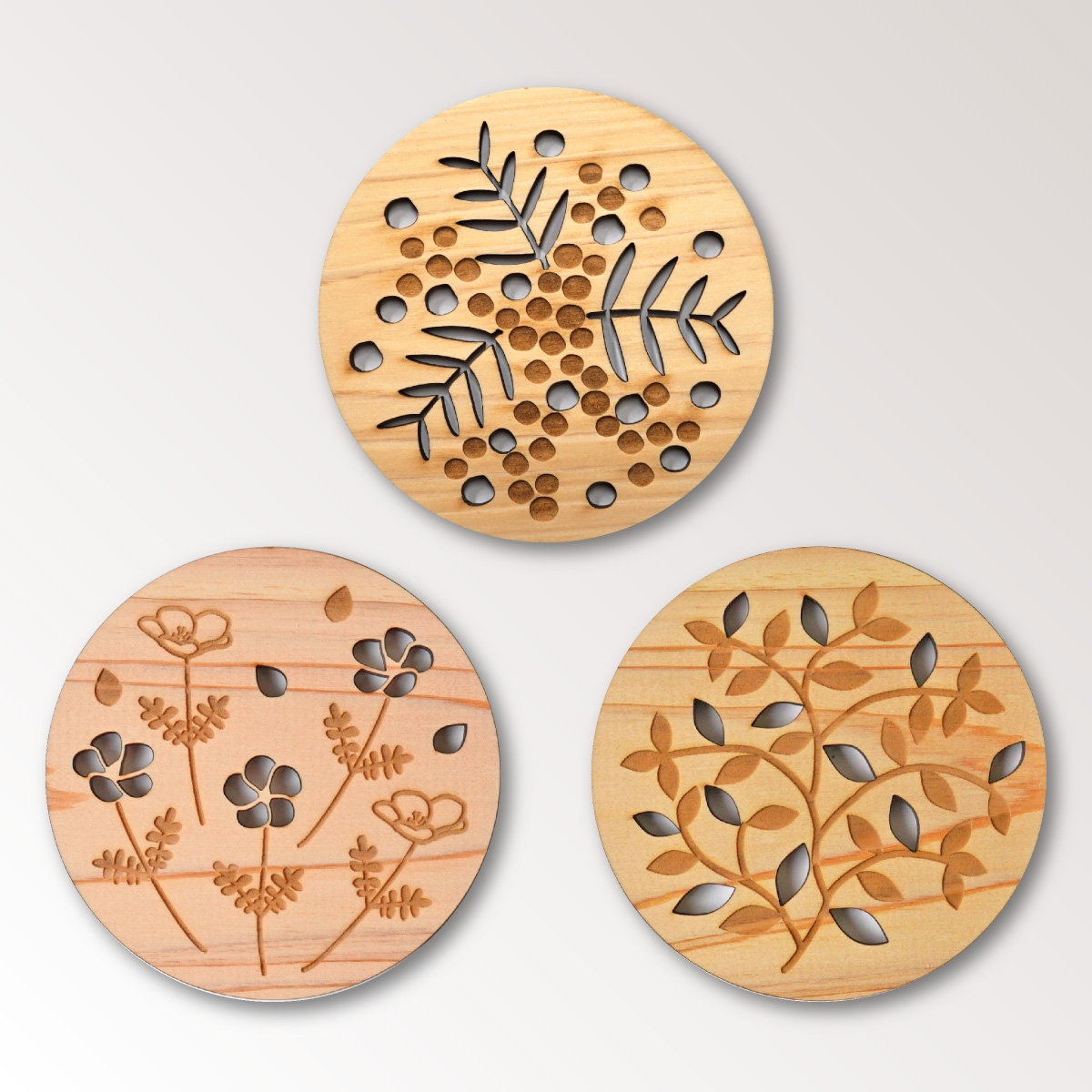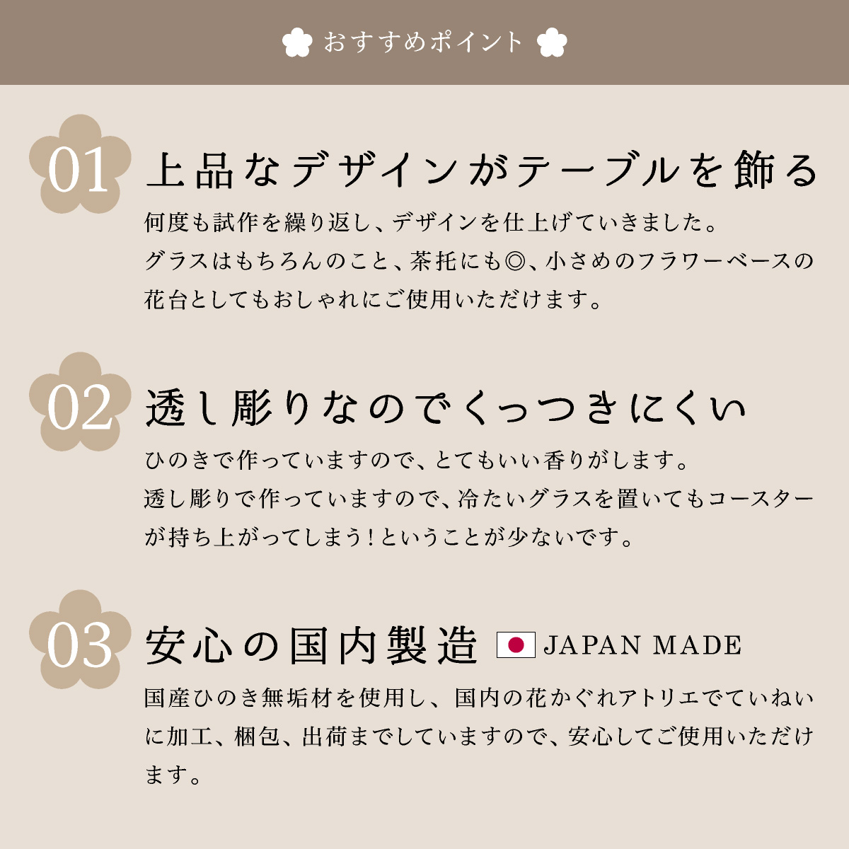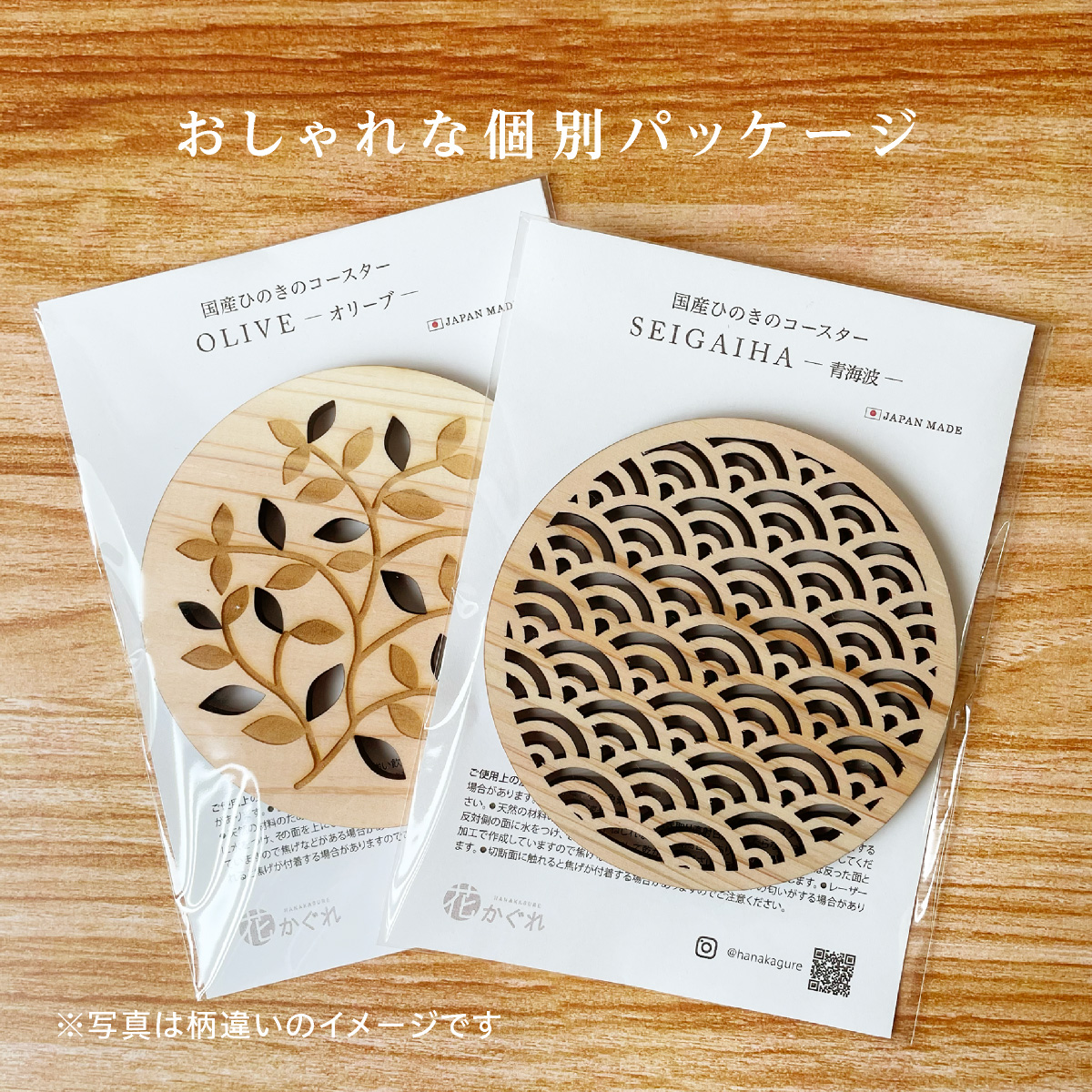 ひのきのコースター 花柄 ボタニカル ミモザ ネモフィラ オリーブ プレゼント ギフト 90mm 木製 木 手作り ヒノキ 檜 日本製 国産 敬老の日 母の日 父の日
