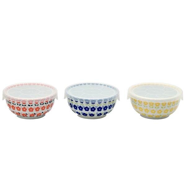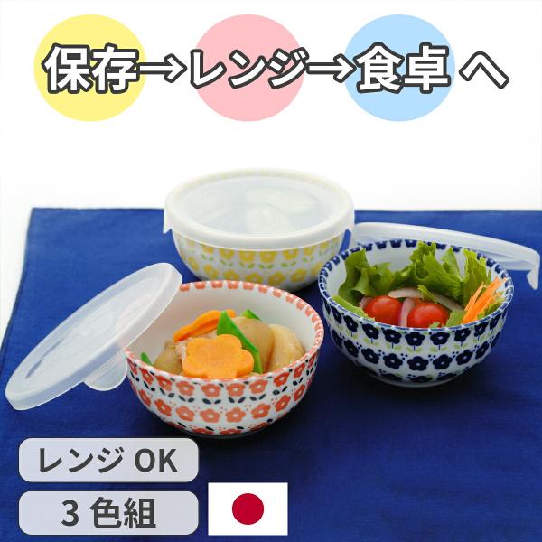 北欧 フラワー パック鉢 3色組 保存容器 蓋付き 小鉢 ボウル 冷蔵保存 温め直し 作り置き 日本製 電子レンジ対応 食器 小皿 ノンラップ 北欧風 花柄 容器 丸型