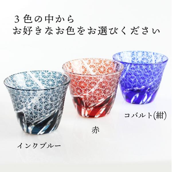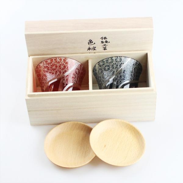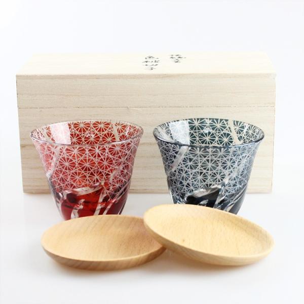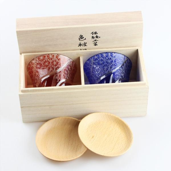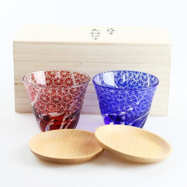 切子 冷茶グラス 2個 ペアセット ブナ小皿付き 4点セット 桐箱入り (コバルト(紺)・赤・インクブルー)食洗機対応