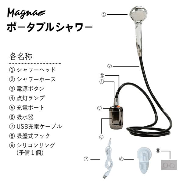 MAGNA(マグナ) ポータブルシャワー 5200mAh USB充電式 120分スタミナ運転 シャワーヘッド