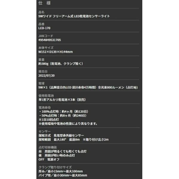 9W ワイドLED乾電池センサー LED-170 ライテックス