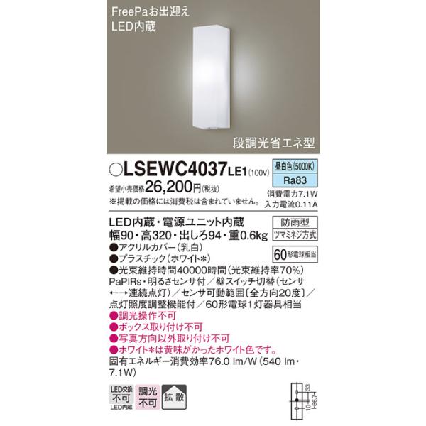 ○[法人限定][即納在庫有り] LSEWC4037 LE1 パナソニック 壁直付 LED 昼白色 ポーチライト 拡散 防雨型 段調光 センサ付 LGWC80290 LE1 同等品 [ LSEWC4037LE1 ]