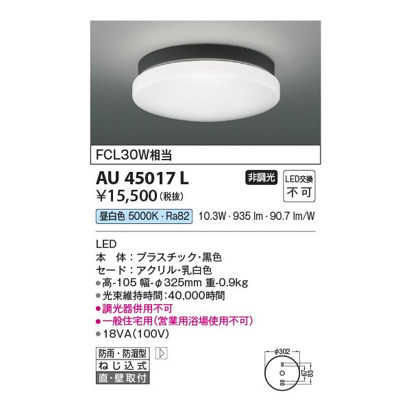 [法人限定] AU45017L コイズミ KOIZUMI 防雨防湿型シーリング FCL30W相当 非調光 昼白色 防雨・防湿型 [ AU45017L ]