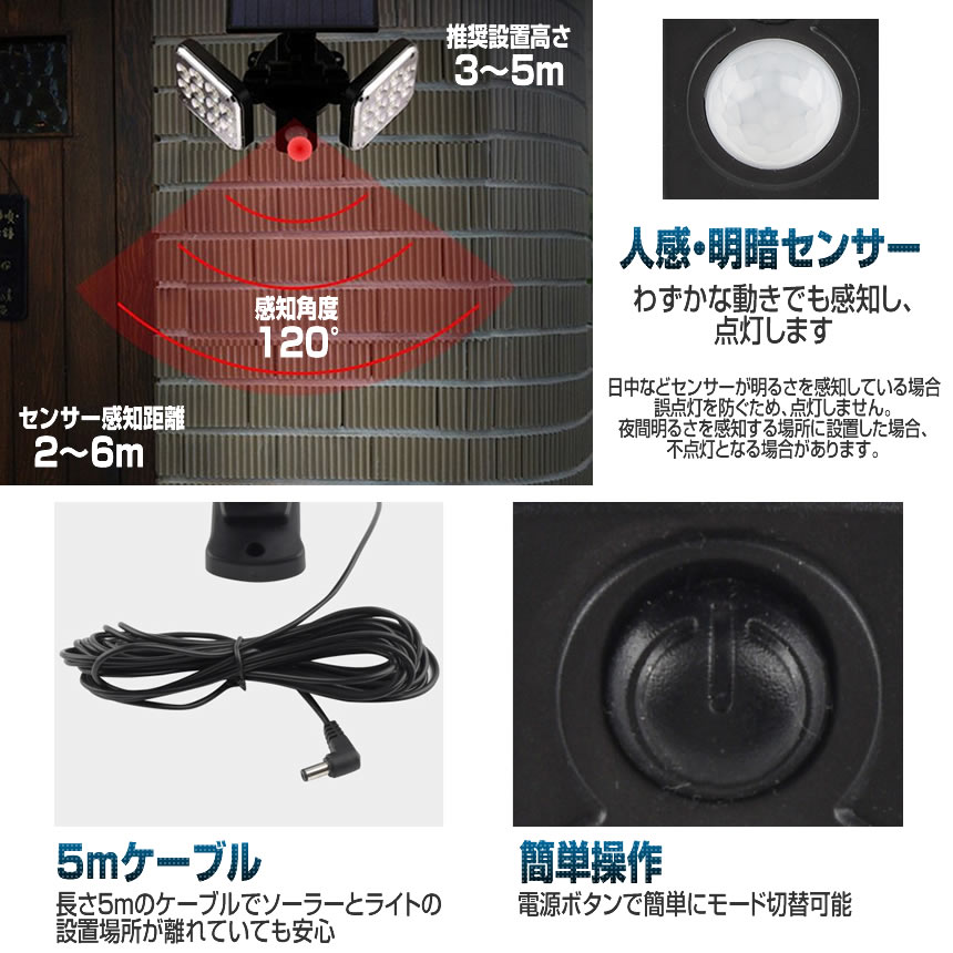 ソーラーライト屋外 2個セット ソーラーセンサーライト LED 分離型 5mコード 120LED 3つの点灯モード モーションセンサー 夜間自動点灯 取付ネジ付 FENTI120LED