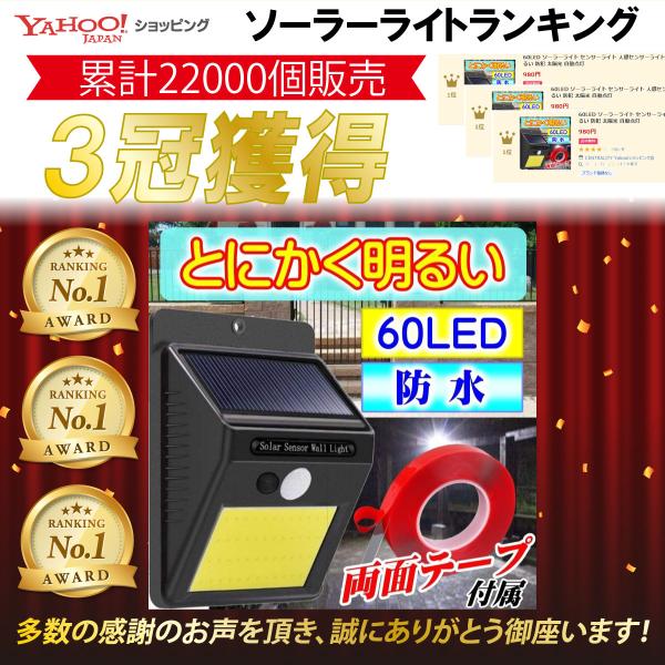 60LED ソーラーライト センサーライト 人感センサーライト 屋外 COB 防水 防犯 駐車場 玄関 カーポート 庭 充電池式 明るい 防犯 太陽光 自動点灯
