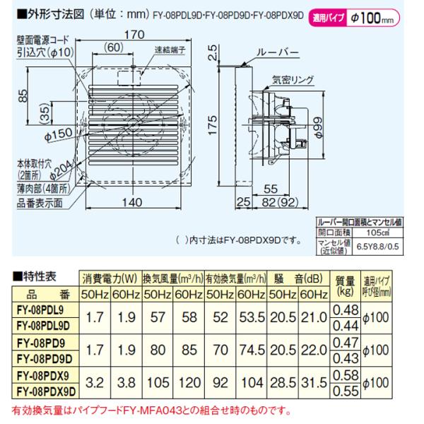 【FY-08PD9D】パナソニック パイプファン パイプファン 排気 プロペラファン 壁・天井取付 角形格子ルーバー 適用パイプ径:直径100mm 速結端子付 panasonic