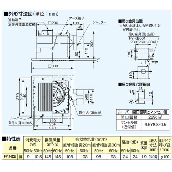 【FY-24C8】パナソニック 天埋換気扇(低騒音形・ルーバーセット) 排気 低騒音形 樹脂製本体 ルーバーセットタイプ 埋込寸法:240mm角 panasonic