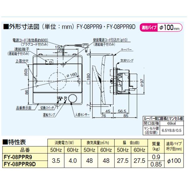 【FY-08PPR9】パナソニック パイプファン 排気 ターボファン 角形インテリアパネル形」ピタンコ」 自動運転形 人感センサー コード、プラグ付 panasonic