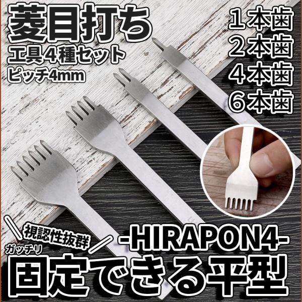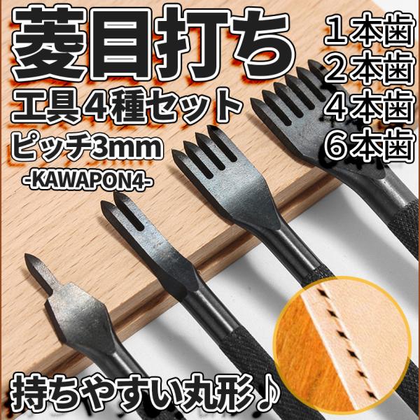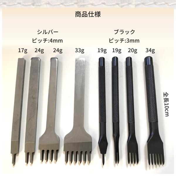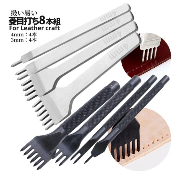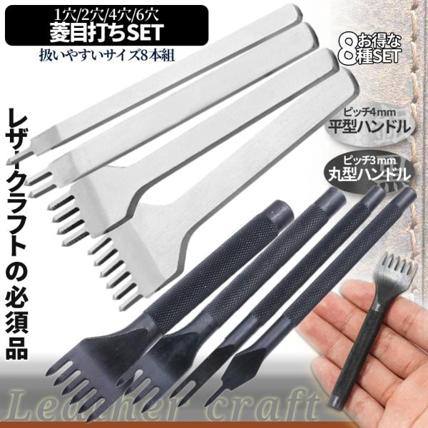菱目打ち 革細工 ポンチ 8本セット 平型 丸型 ピッチ 4mm 3mm レザークラフト レザーポンチ 皮ポンチ 1本歯 2本歯 4本歯 6本歯 工具 レザーワーク PONCHSET