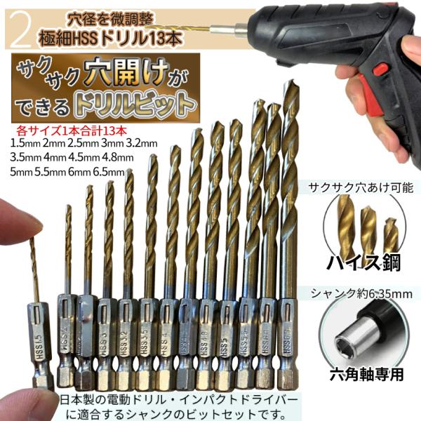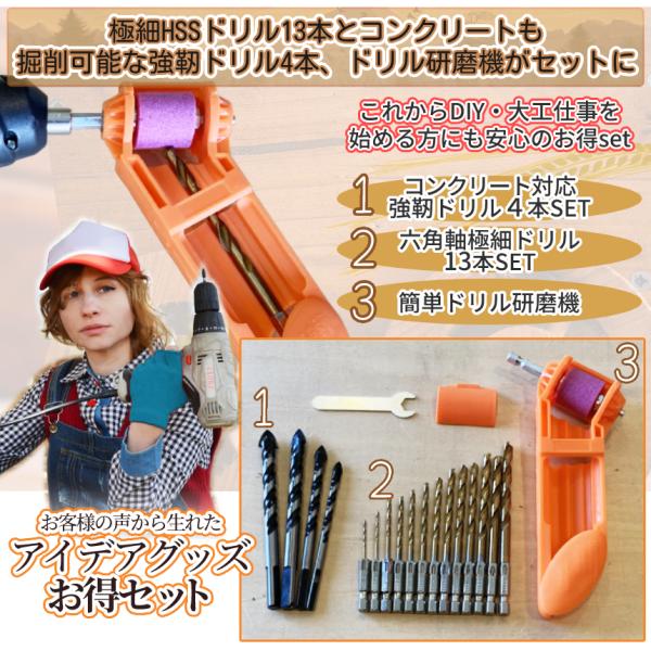 ドリル セット 研磨機 付き HSS鋼 1.5-6mm 極細ドリル 13本 コンクリート 掘削ドリル 4本 六角軸 穴あけ 研磨 シャープナー 電動 ドライバー DIY 工具 DORISET3