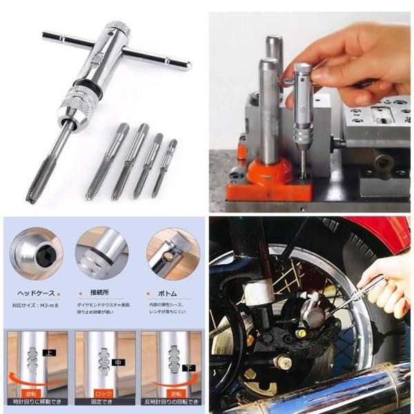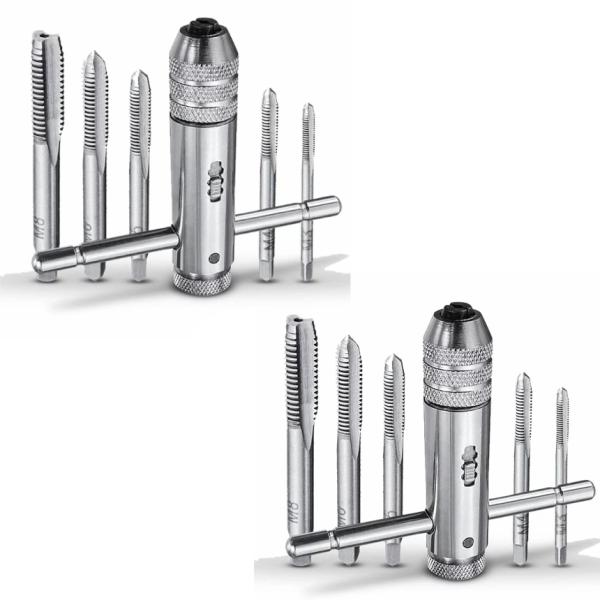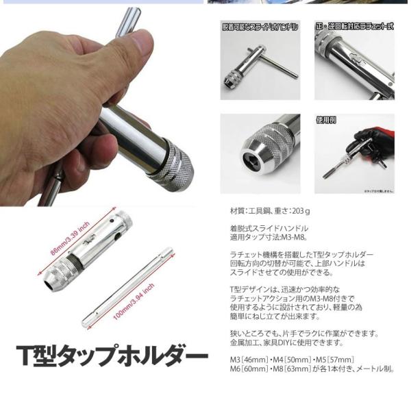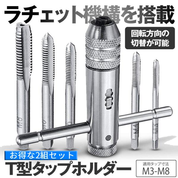 T型 タップ ハンドル ラチェット式 T字 タップレンチ タップホルダー 2セット ねじ切り 5本付き ネジキリ ネジ ねじ ネジ山 回転 切替 工具 DIY M3-M8 2-TTAP
