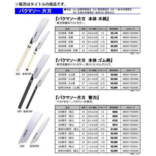バクマ工業 バクマソー 265替刃 3枚入 刃厚0.6mm 切り溝幅0.9±0.05mm 刃のピッチ1.75mm 片刃のこぎり用 鋸用替刃 BAKUMA ネコポス可 '
