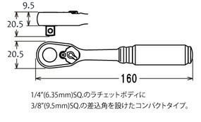 Ko-ken 2725Z3/8L160 Z-EAL 3/8"(9.5mm)差込 ラチェットハンドル(スリム)全長160mm ギヤ歯数72 コーケン/山下工研